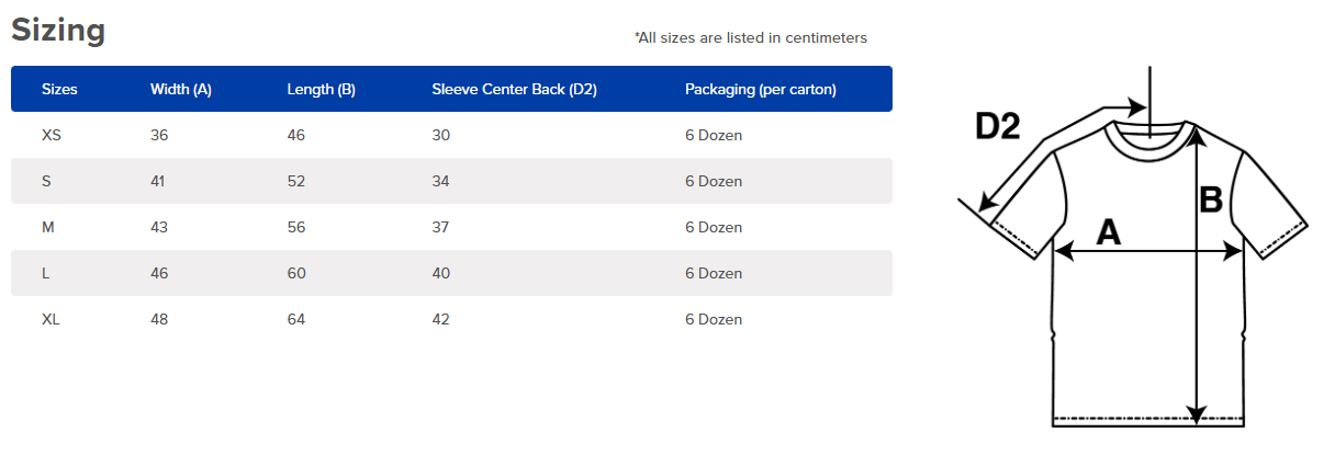 Fit: Modern Classic fit - please check the size chart to avoid disappointment. Generous sizing. Lay your own tee flat on a table, measure armpit to armpit across the chest and match to the size you feel is best. Please note measurements can vary within 2.5cm, this is within the accepted tolerance.